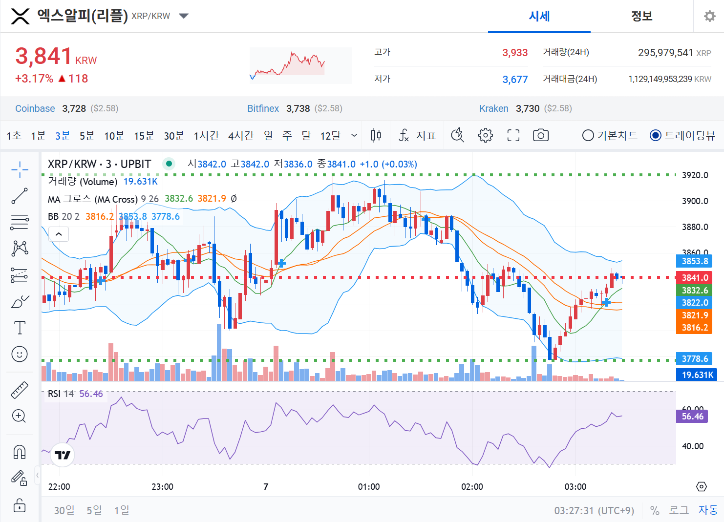 - 현재 9일 및 26일 이동 평균선이 3821.9 ~ 3832.6 KRW 구간에서 교차하며 수렴 중입니다.