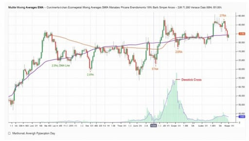 - 데드 크로스 (Death Cross): 단기 이동 평균선이 장기 이동 평균선을 하향 돌파할 때 발생합니다. 이는 하락 추세의 시작을 나타내는 신호로 해석됩니다.