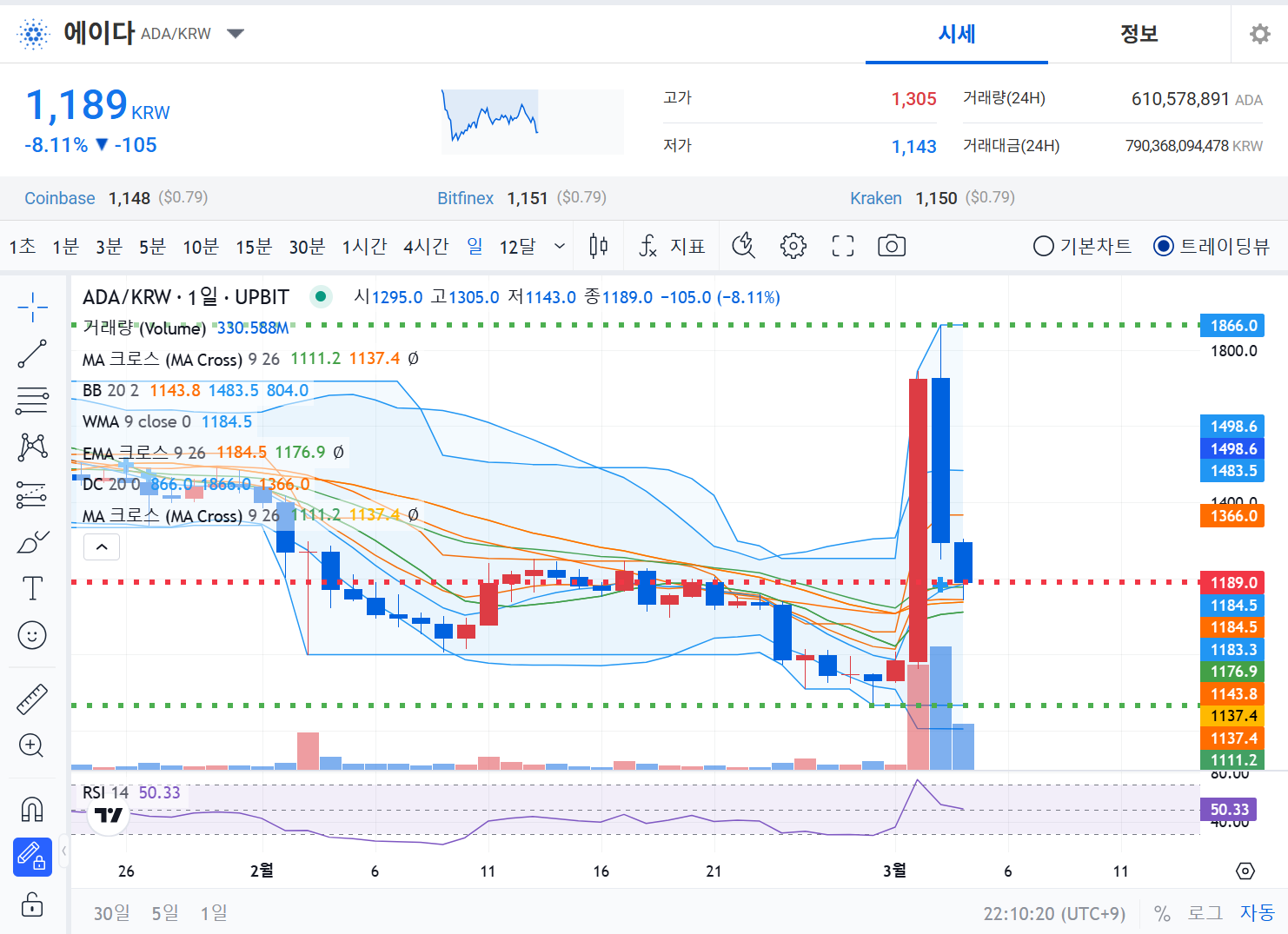 [2025년 3월 4일 22:00] 에이다(ADA/KRW) 차트 분석: 급등 후 조정, 추가 상승 가능할까?