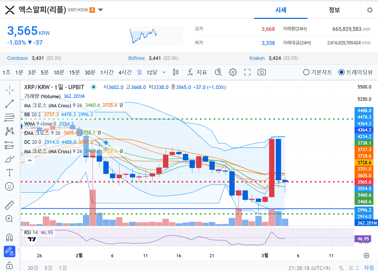 - XRP 가격: 3,565원 (-1.03%), 3,500원 지지 테스트 중